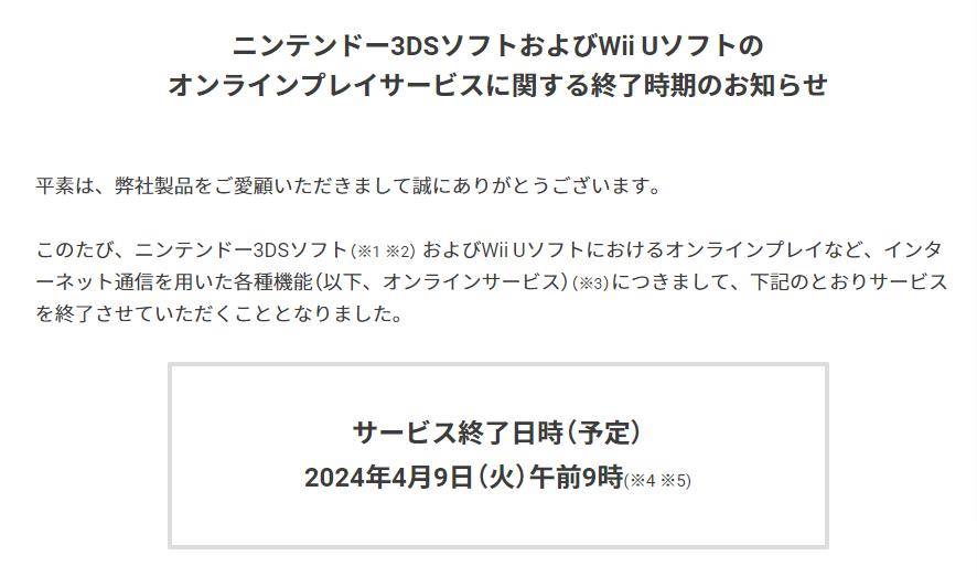 今天,任天堂官网发布公告,宣布3DS和Wii U在线服务将在4月9日早9点(北京时间8点)终止,届时游戏商城及联机功能将无法使用。