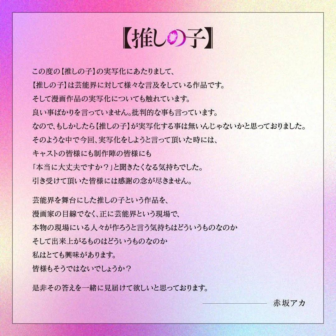 同时,漫画作者赤坂明也就这一企划发表了自己的感想,尤其是考虑到原作涉及过多“批判演艺界”的内容,赤坂向全体愿意出演该作的演员和参与制作的成员们表示了感谢。
