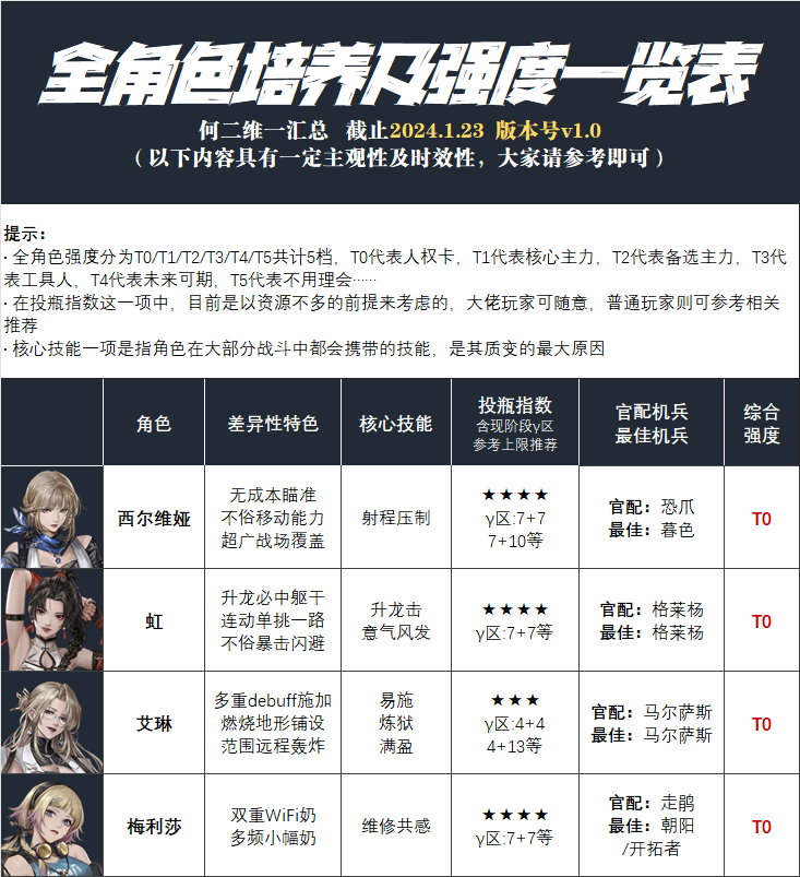 - 不同角色的强度问题,这点其实是在不断变化的,例如针对上一版开服1个月左右的综合强度榜而言,此次维一是将艾琳、芙烈达两位角色提升到了T0的级别,上一版本她们俩都是T1的评价,这样做的原因更多是参考到其在当下版本的超高不可替代性与部分朋友的积极反馈,当然还有其余角色也是做了部分强度修正调整的,大家待会在一图流汇总表格中便能看到了
