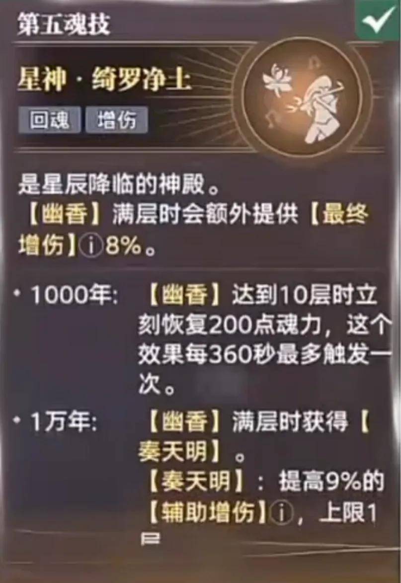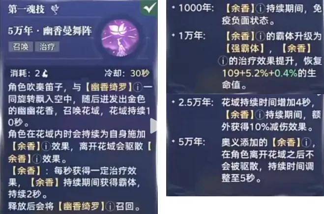 接着5被动嘛则是相反会不断积累“幽香”状态,其中幽香满层时神赐魂环可以让叶原额外提供8%的最终伤害提升,这个幅度倒是和之前的类似于小舞等角色类似,不过综合对于一位辅助角色而言,维一个人认为还是设计的稍显保守了点,给到10%左右应该也是可以接受的吧。