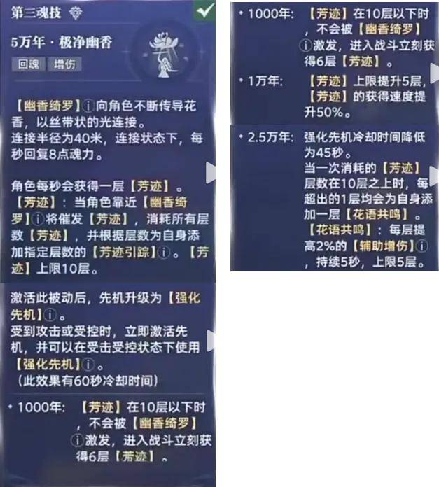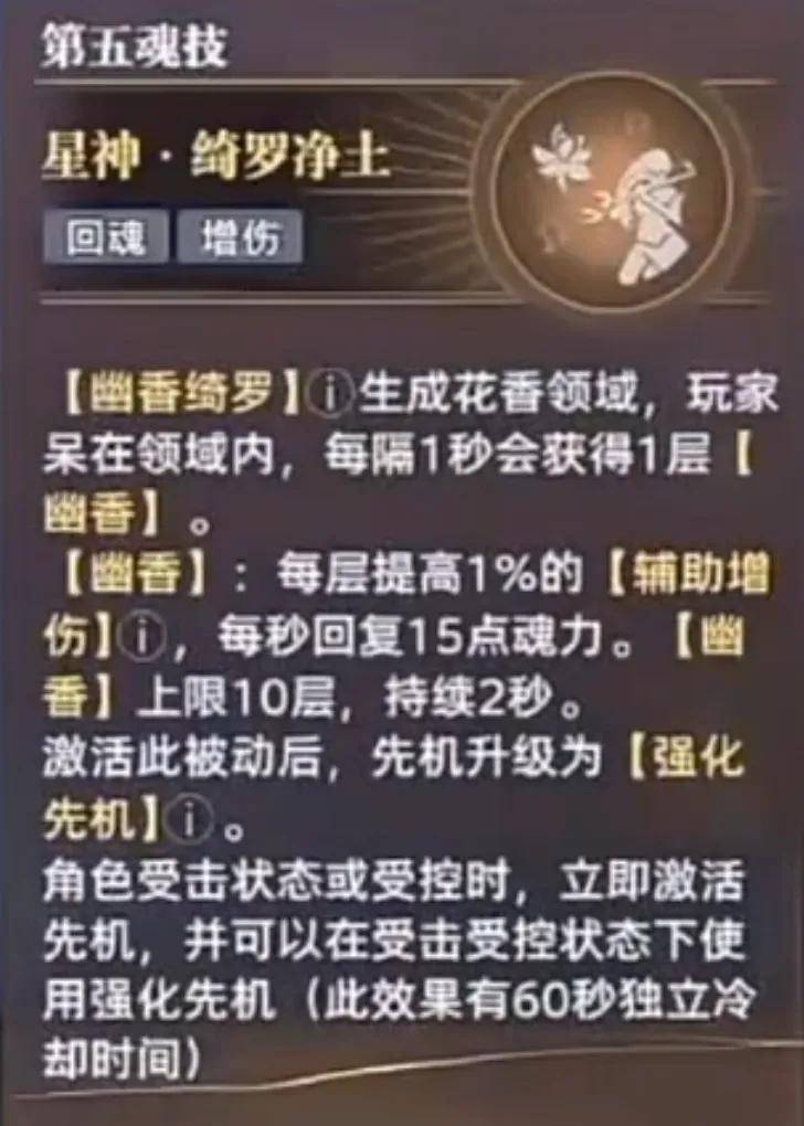 不过好在这个5被动还有个每秒15点魂力的回复效果,但其花香领域的范围根据官方之前的技能展示,应该会比40米这个3被动的连接范围要小一些,所以这个回能也是一个更加适合于站桩类攻击的被动。