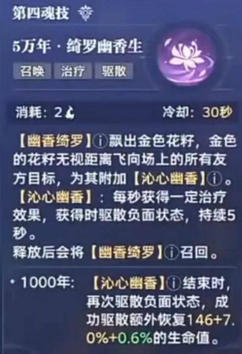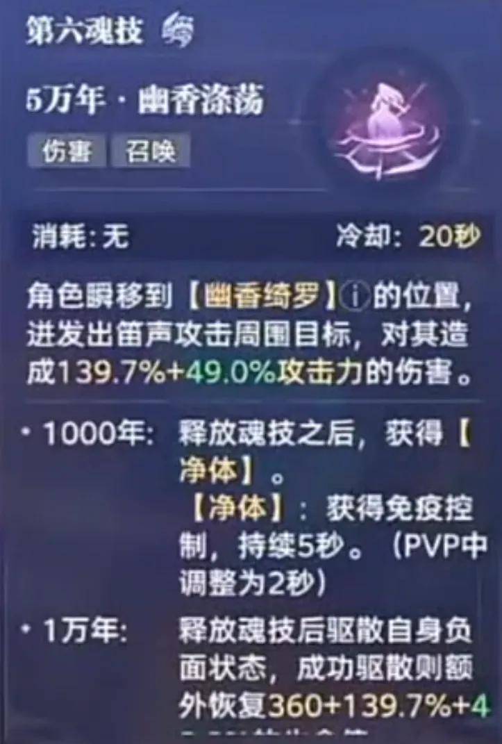 然后6魂技则是可以将幽香绮罗给召唤到自身周围,同时获得免控效果,这个在PVP中虽然只有2秒的时间,但也是足够有意义了,最后这个魂技也有驱散和回复生命的效果。