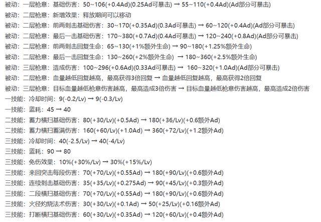云缨大改:被动枪意的伤害和回血增加,但血量很低时的伤害和回血降低,二层枪意新增可移动释放,2/3技能改为额外Ad加成。(云缨更加灵活,但操作上限降低,上手更容易,容错率增加)