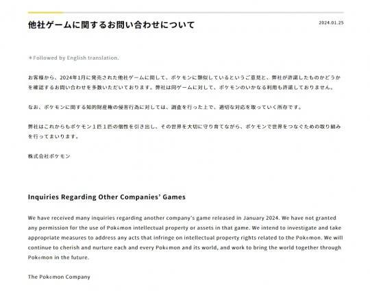 “我们收到了很多关于另一家公司在2024年1月发布的游戏的咨询。我们没有授予在该游戏中使用宝可梦知识产权或资产的任何许可。我们打算进行调查,并采取适当措施,以解决任何侵犯与宝可梦相关的知识产权的行为。我们将继续珍惜和培育每一个宝可梦和它的世界,并在未来通过宝可梦连接全世界。”