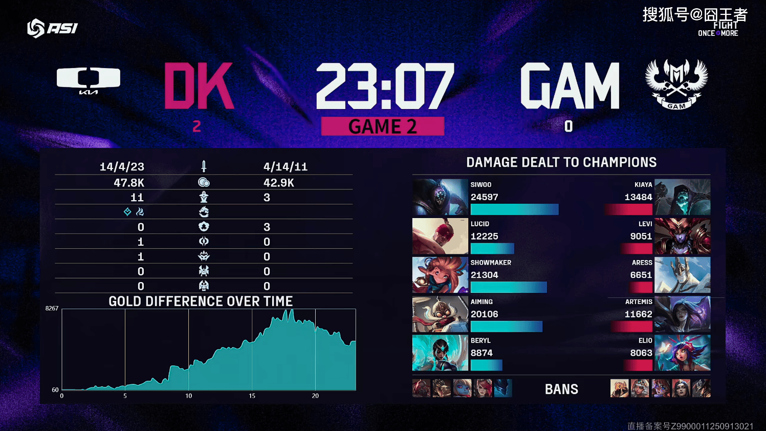 结果第一局比赛,双方差距明显,DK打成了单方面的碾压局。3分钟左右,双方同时三包一越塔上单,但Siwoo狼母换掉Elio布隆;8分钟左右,Lucid猴子抓住机会单杀Levi皇子,DK上半区碰撞完成1换2;16分钟左右,Levi脱节率先被集火秒杀,ShowMaker兜住残局拿下三杀;23分钟左右,DK团战碾压顺势拆掉中路高地;最终26分33秒,DK团灭GAM,先赢一局!
