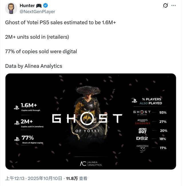 有消息称《羊蹄山之魂》“推测”销量超过160万,卖给零售商的销量超过200万,77%销量为数字版。