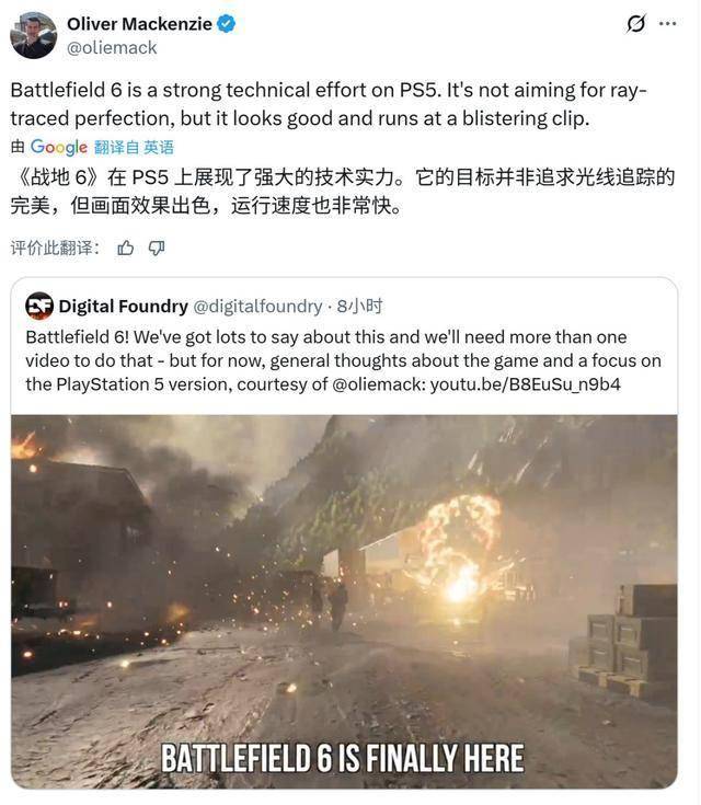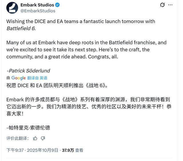 已经离职的前EA工作室群负责人兼DICE总经理Patrick Soderlund给《战地6》送上祝福: