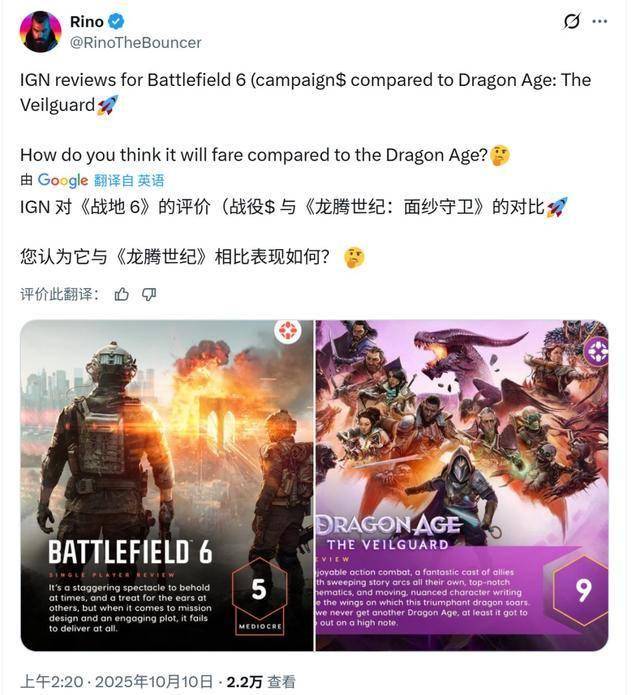 网友不满《战地6》IGN单人战役仅给5分评价,剧情平淡大翻车的《龙腾世纪:影障守护者》都能有9分: