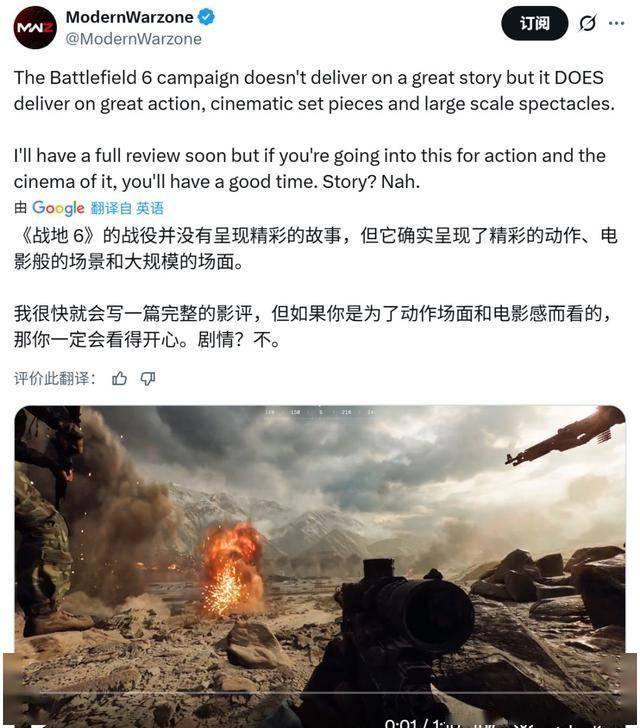 《战地6》的单人战役共9个任务,仅5个小时流程,《战地6》的战火燃得不久,也不耀眼。它在视觉上偶尔令人震撼,听觉上也颇具享受,但在任务设计和剧情张力上却完全乏善可陈。虽然能带来一个下午的短暂乐趣,但它只是对昔日《战地》的一次安全重塑,距离一场大胆的革新——一种它如今本应达到的蜕变——仍有很远的距离。