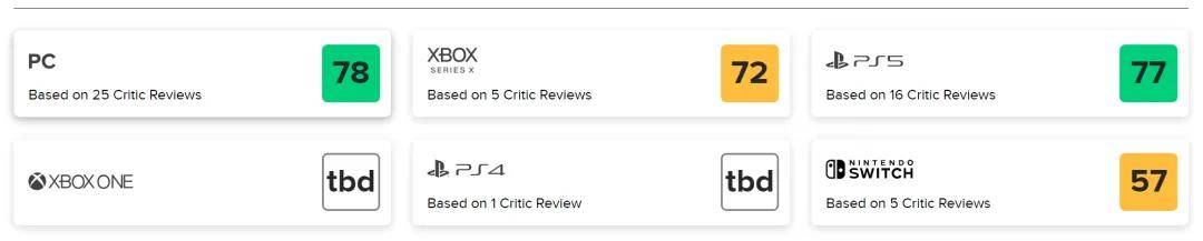 而且出现了版本不同,评分不同的现象。MC初始平均分数PC评分78,XBOX评分72,PS5版获得了意外的83分高评价,目前已经降到77。