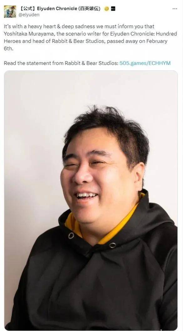 《百英雄传》官推发布悲报,游戏主创村山吉隆因多器官脏器衰竭,于2024年2月6日医治无效去世,享年55岁。