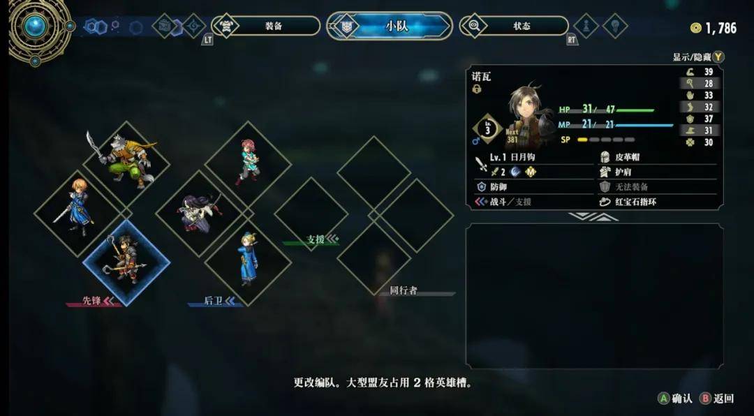 角色可同时上场6名,分为先锋和后卫前后两排,还能设定一名支援角色和三名同行者,也就说最多一个小队可以有10人登场。