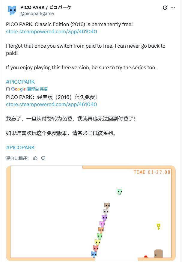 据官方透露,他本意仅打算推行限时免费活动,却忽略Steam平台“付费转免费”操作不可逆的关键规则。直至系统提示“该作品已于2021年实行过免费,根据协议条款无法恢复收费”时,才意识到失误已成定局。官方在公告中表示:“除了笑对这件事,我别无他法,那就请大家尽情享受免费版《Pico Park》吧!”