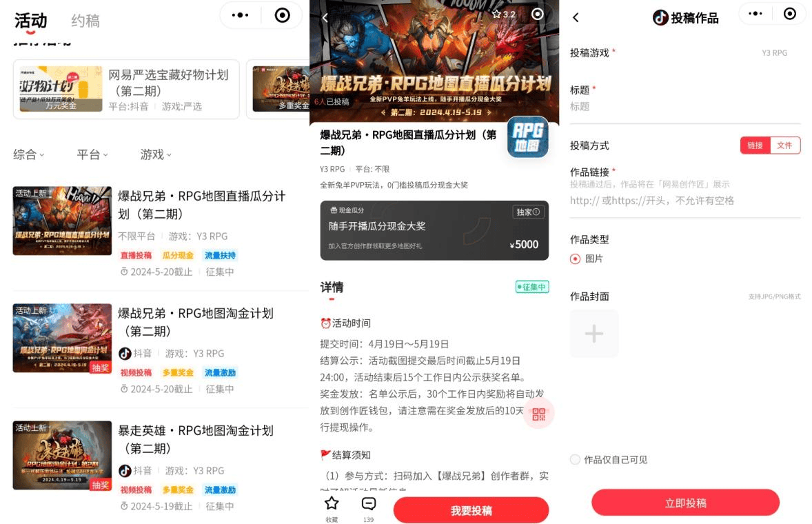 进入小程序【首页】选择RPG淘金计划活动参与,可进入意向可查看详细活动内容,活动对应的报名入口就在下方。在视频制作完成或直播完成后,在对应活动下方点击【我要投稿】,点击【投稿作品】,选择已认证平台【抖音】,根据认证弹出视频,自行选择作品提交(直播截图需手动提交)。然后就可以坐等瓜分现金大奖喽~