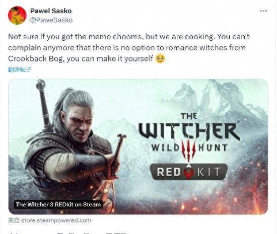 《巫师3》任务设计师Paweł Sasko在推特上分享了该工具,庆祝官方Mod支持终于上线,表示:“现在你们不能再抱怨没法和三姐妹谈恋爱了,你们可以自己做。”