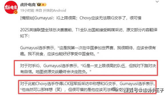 不过在此之前,倒是有韩国媒体对T1众选手进行采访,其中他们也谈到了IG,并且对IG作出不一样的评价。小吕布就表示这是自己第1次在中国参加世界赛,自己特别期待,因为自己不挑食,所以这次应该可以好好享受一下中国食物。同时小吕布也认为IG是一支上限很高的队伍,但是自己对下路对决是很有信心的。此前Chovy选手曾表示想和IG交手,但是我觉得他应该是没有办法和IG交手了。