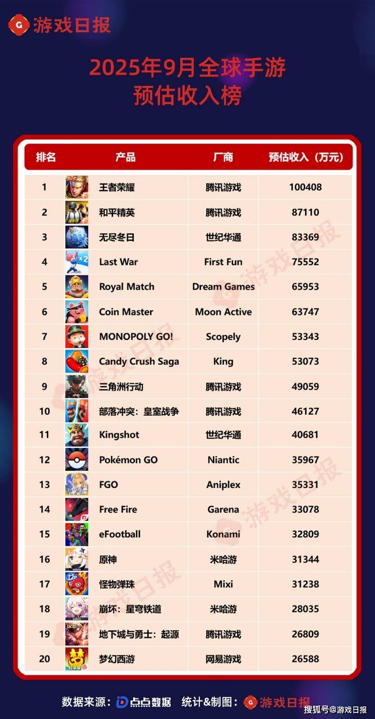腾讯旗下《三角洲行动》9月份排名上升10位冲进TOP10。9月17日《三角洲行动》更新新赛季“烈火冲天”,并首次在iOS畅销榜登顶。9月20日《三角洲行动》全球iOS+Google Play单日预估收入超过3400万元,创下上线以来的最高峰值。在9月份举行的一周年线下庆典上,官方还公布国服最新日活数据为3000万。