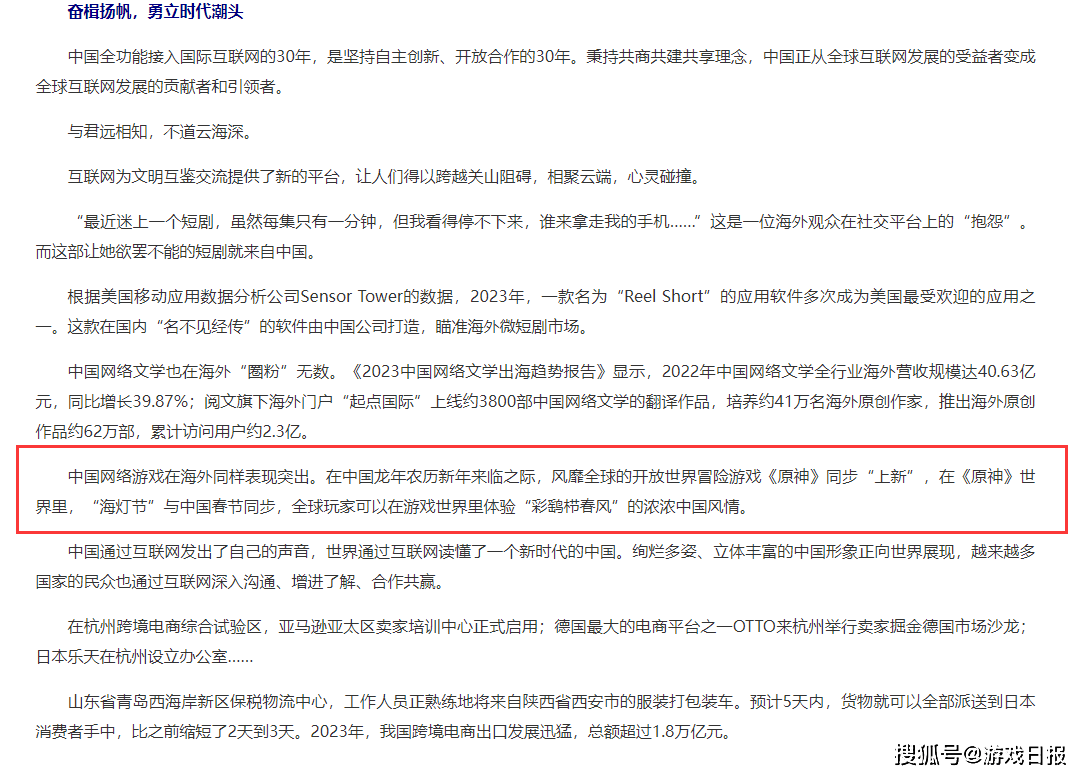 近日,由国家网信办主管、中国网络空间研究院主办的杂志《中国网信》2024第4期上线。在这一期中报道,官方回顾了我国接入国际互联网的30年的互联网述评和成就,其中在讲述自主创新和开放合作时,这篇杂志就谈到了以《原神》为首的中国网络游戏在海外的突出表现。
