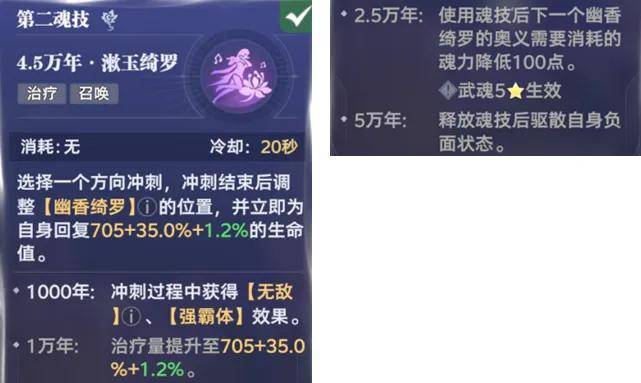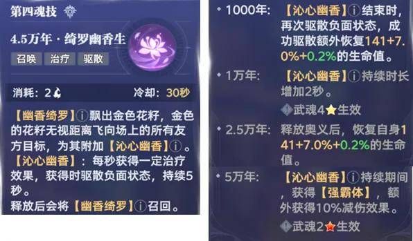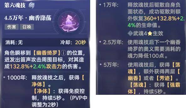 接着则是第6魂技,这个技能和2魂技相反,则是立刻会回到幽香绮罗周边,并且可以免疫对方的控制技能,PVE基础5秒,PVP则是基础2秒持续时间,此外这个技能还有小幅输出+驱散+使下一次能量消耗减100点等能力,这些和2魂技都比较类似,不过在提升到红色2星后,6魂技还能额外获得2层3被动的“芳迹”状态或是5被动的“幽香”状态,并且还有持续5秒的强霸体效果。
