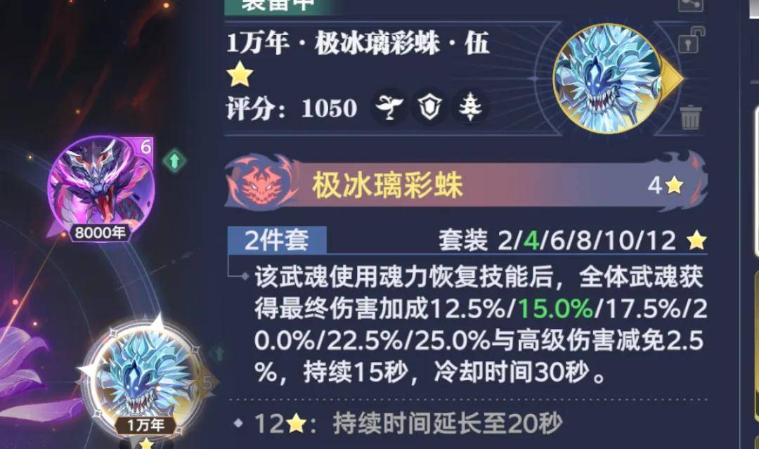 接着叶原的魂核搭配由于她没有护盾施加的能力,所以“玄龟”肯定是没啥效果的,而又由于她并没有直接可以回能的技能,通过实测维一也发现她的魂技和奥义都无法直接触发“冰蛛”魂核的增伤效果......所以冰蛛也是无效的,这这这说白了叶原也就剩下“焰狼”和“蛛皇”两个魂核可选了嘛......当然由于叶原的魂力回复效果并不是需要经由她使用技能才能触发,所以维一也觉得实战中她带“焰狼”魂核的效果的确还行,大家可以参考一二。
