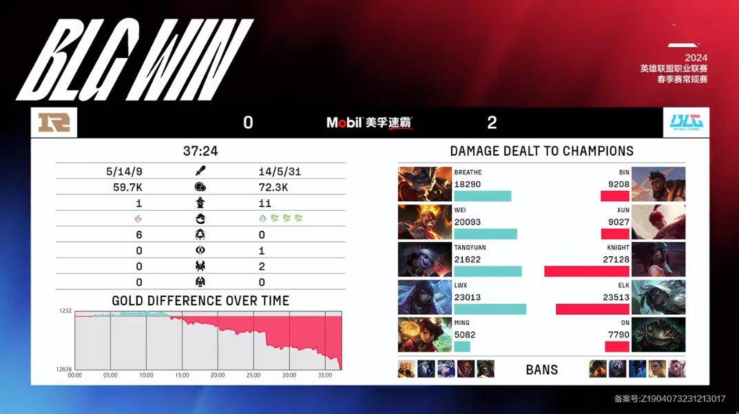 第一局很碾压,双人组的卢米和野核千珏基本上没有给RNG太多还手的机会。第二局RNG也拿出了火男打野,不得不说这个英雄在前中期还是给到了BLG不小的压力,但是随着BLG控下炼金龙魂,中后期塞恩塔姆阿卡丽发力,最终还是以2-0赢下了这场Bo3。