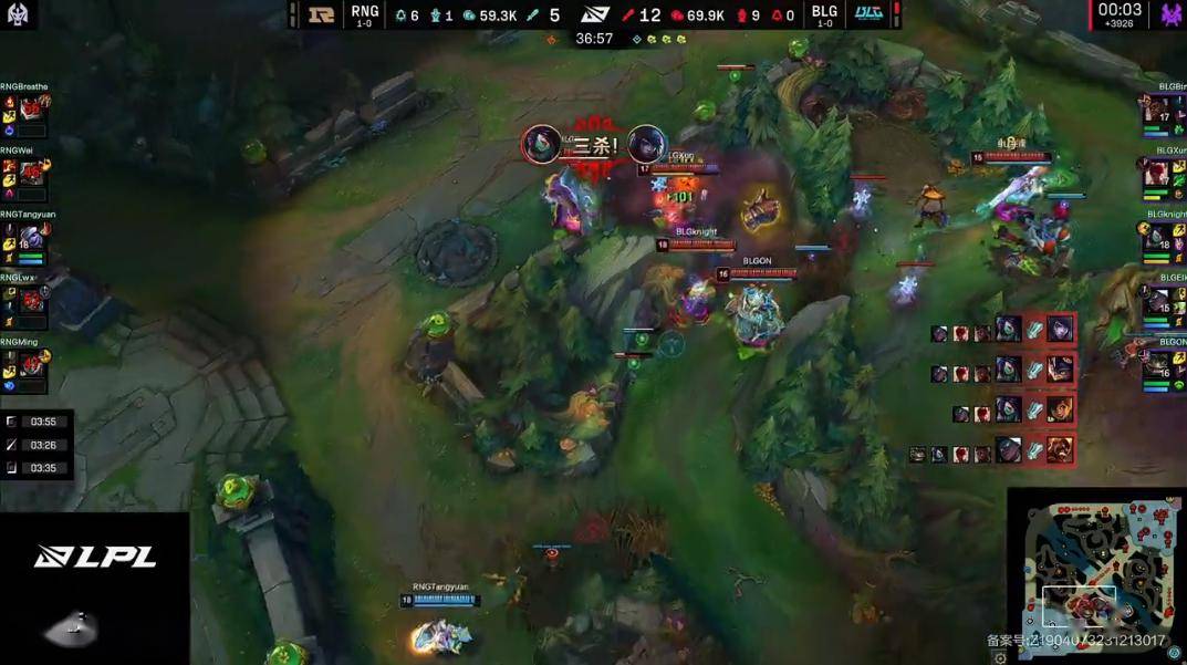 RNG在转线期和团战方面都没有BLG处理的好,很多时候都是在白亏资源,火男打野前期出金身也不是一个好的选择。另外BLG一个顶在前排的塞娜塔姆,一个绕后偷袭的阿卡丽,团战里RNG这个没有前排的阵容,光靠明烛是没什么用的。