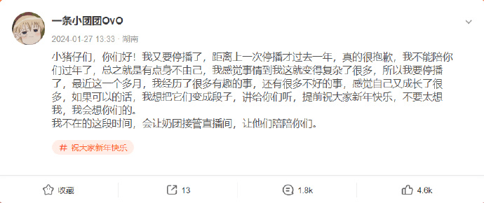 1月27日,主播“小团团”曾在斗鱼鱼吧发动态宣布停播,此后再无音讯,而她的微博更新停留在2023年12月2日。