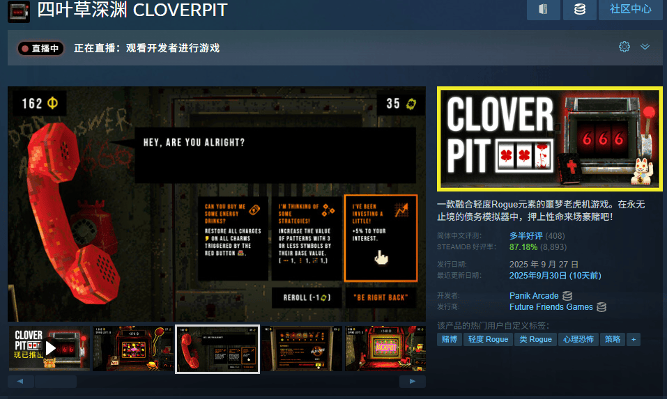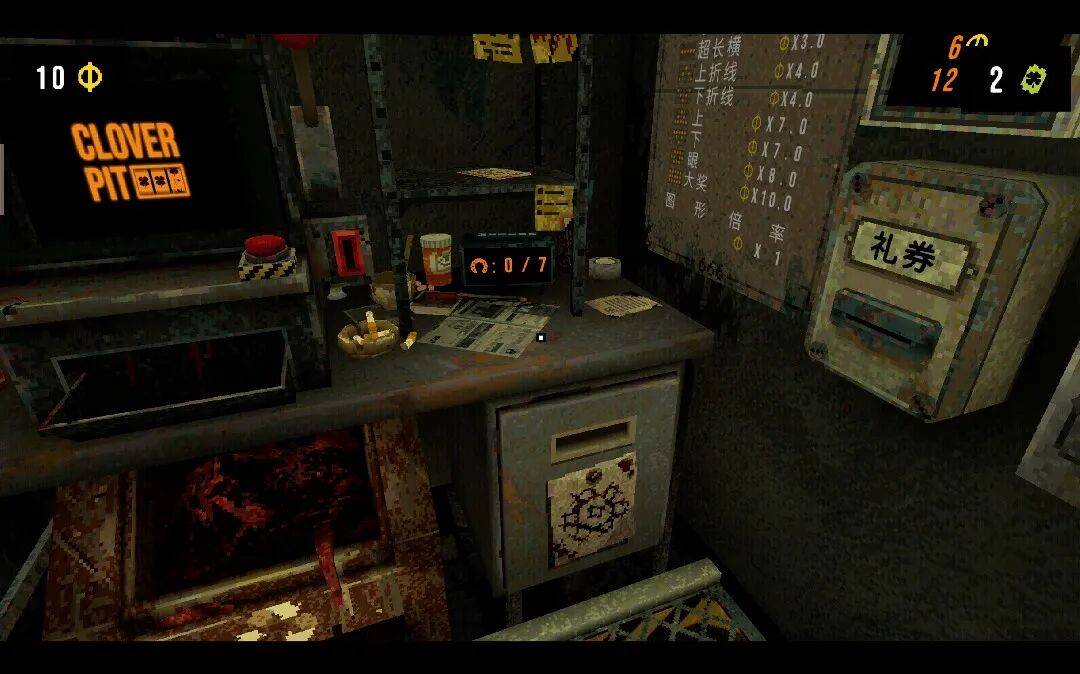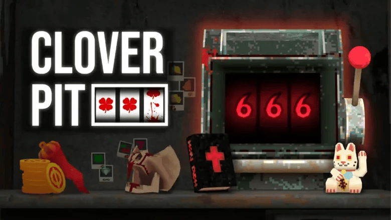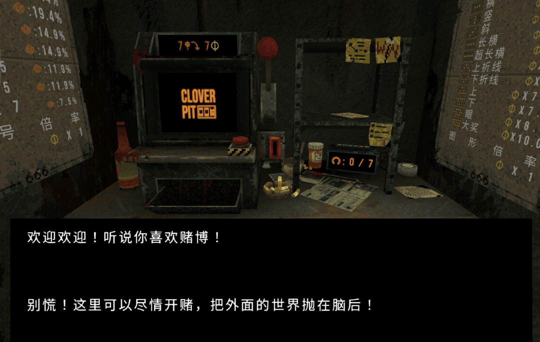 一间只够转身的狭小牢房,它大门紧锁,锈迹斑斑,灯光昏暗。房间里放置了一台老虎机,一部电话,一个供玩家购买道具的柜台,一台ATM,这就是近期走红的肉鸽“赌博”游戏《四叶草深渊》(CloverPit)的场景全貌。