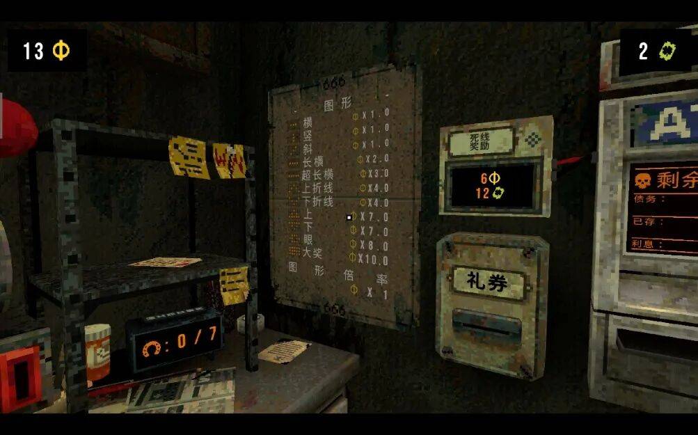 在这个空间里,“你”被告知需要赚到足够的金币来还清债务。而赚取金币的唯一方式,就是在面前的老虎机上扳动机关,进行“赌博”。只有在“死线”(还款日)前,向ATM内存入足够多的金币,才可以存活到下一轮,争取逃离的机会。否则,脚下的闸门会立即打开。当玩家掉入深渊,生命终结,一切就得从头再来。