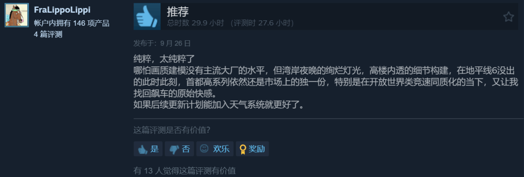 从一些玩家评价里,也能看到这款游戏之所以受推崇,很大程度上就是因为打破了当下赛车游戏日渐固化的“开放世界”模式。这样的小体量作品,一样能靠着极简设定和纯粹的驾驶乐趣获得口碑,恰恰说明了赛车游戏的未来依然可以在“赛道”里,而不是越来越大的开放世界地图。
