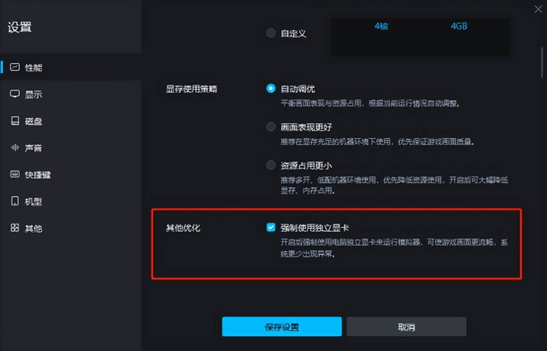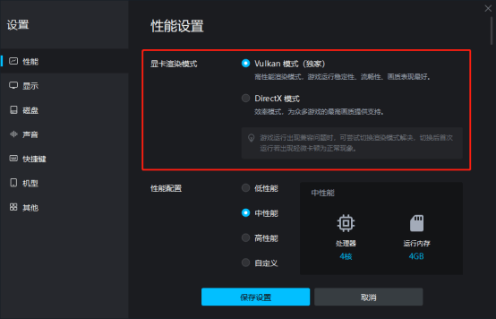 大部分用户将性能设置为“中”即为合适配置,可流畅运行绝大部分游戏,配置较差的玩家,自定义不低于“2核/2G”,如果游戏包过大或者游戏画质要求高,则不低于“4核/3G”。 (注:这里不是设置得越高越好,CPU核数最高不得超过电脑核数的一半,否则会产生卡顿。)