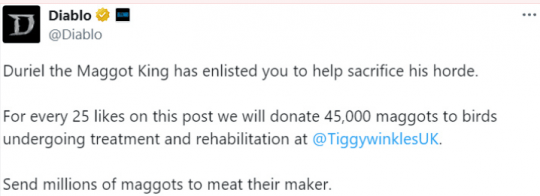 4月22日是世界地球日,为纪念这个日子暴雪向英国专业动物医院蒂基温克尔斯(Tiggywinkles)捐赠了三千万只蛆虫,用以喂养并拯救鸟类。《暗黑4》作为游戏内活动的实施者,蛆虫之王督瑞尔难得当了回主角。(太适配了)