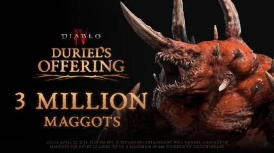 《暗黑4》官方发布了一则推文动态,每获得25个赞,暴雪就会捐赠内含45000只蛆虫的“爆汁大桶”。捐赠活动上限为666桶,约3000万只蛆虫,价值超千万美元。而在这条动态发出后不久,捐赠目标就已经达成了。据悉,这份捐赠足够蒂基温克尔斯的鸟吃两年。