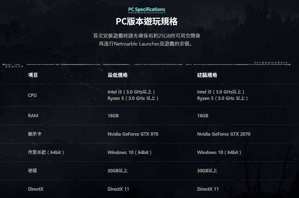 在进行PC版本下载之前,您需要确保电脑满足游戏最低配置,以及空间拥有25GB的存储空间, 下图为官方推荐的系统配置,趁着游戏还没开服上线,小伙伴们可以依照下面的配置图,对比一下自己的电脑设备,看看是否需要升级,这样才能在正式开服上线顺利进入游戏畅玩。