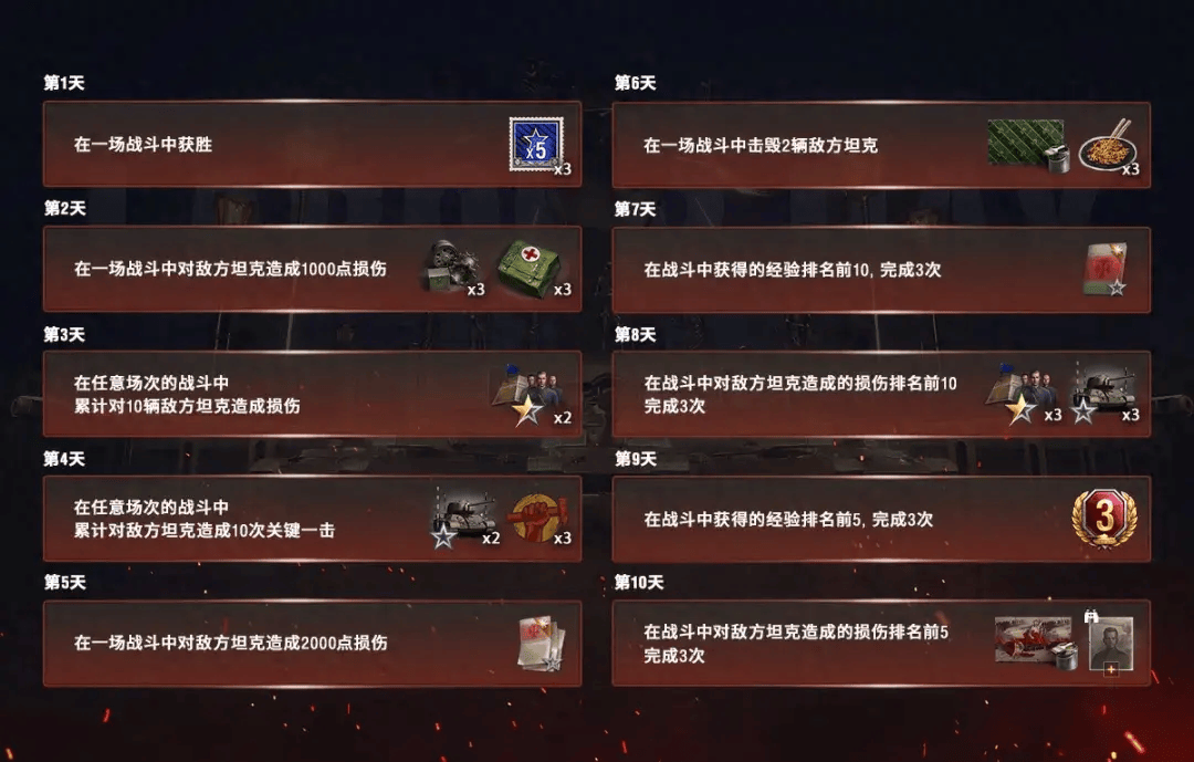 每天登录,完成任务,获取属于您的奖励!奖励包括个人储备、乘员手册,以及其他实用资源。请注意,任务数量为10个——您同样也只有10天的时间来完成任务。因此,请勿错过任何一天,只有最投入、最专注的玩家才能获得全部奖励!