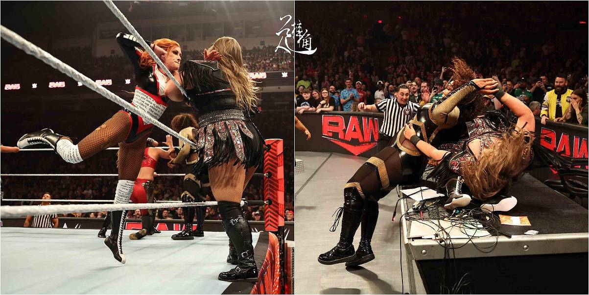此前,奈娅在台下将贝基砸了三次才砸穿解说台,我也就不说什么了,更不make sense的是,贝基遭受了如此重创,居然还能在战局最紧张之时,以残血状态返回赛场,并同台上的二人展开厮杀