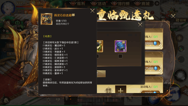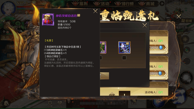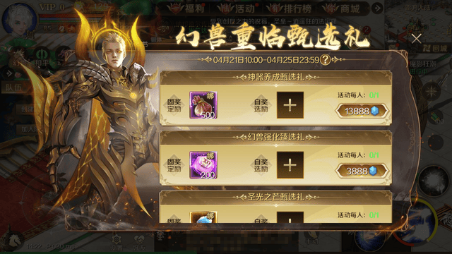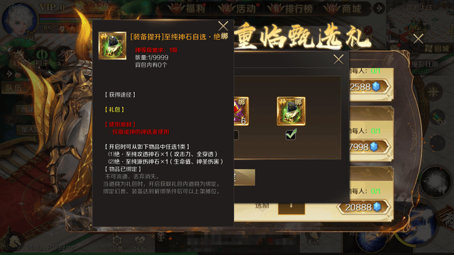 消耗13888点魔石购入神器养成甄选礼(每人限购1次),可获得500份神器洗练自选包[绑]。另外,还可从20份神佑突破自选包[绑]、60份神鉴灵境[绑]、320份神器晶核[绑]中任选一个。这几个自选奖励中,优先选择神佑突破自选包,3阶和4阶神佑突破石的价值还不错,可以用来突破神器槽位的神佑等级。如果暂时不需要,那就选神鉴灵境!