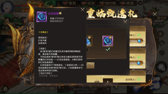 消耗3888点魔石购入幻兽强化臻选礼(每人限购1次),可获得200份XO兑换信[绑]。另外,还可从888份神影兽精华[绑]、888份奇异兽精华[绑]、222份幻灵泪晶[绑]中任选一个。比较推荐幻灵泪晶,无论是在灵泪晶商店兑换1星或2星幻灵,还是在普通炼灵与幸运炼灵时进行消耗都行。