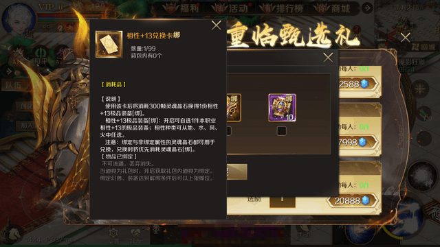 消耗20888点魔石购入至臻攻击甄选礼(每人限购1次),可获得1份3星攻击1-6选极[绑]。另外,还可从1份相性+13兑换卡[绑]、1份史诗宝石圣徽[绑]、10份天阶幻灵圣令[绑]中任选一个。优先推荐相性+13兑换卡,其次才是史诗宝石圣徽。