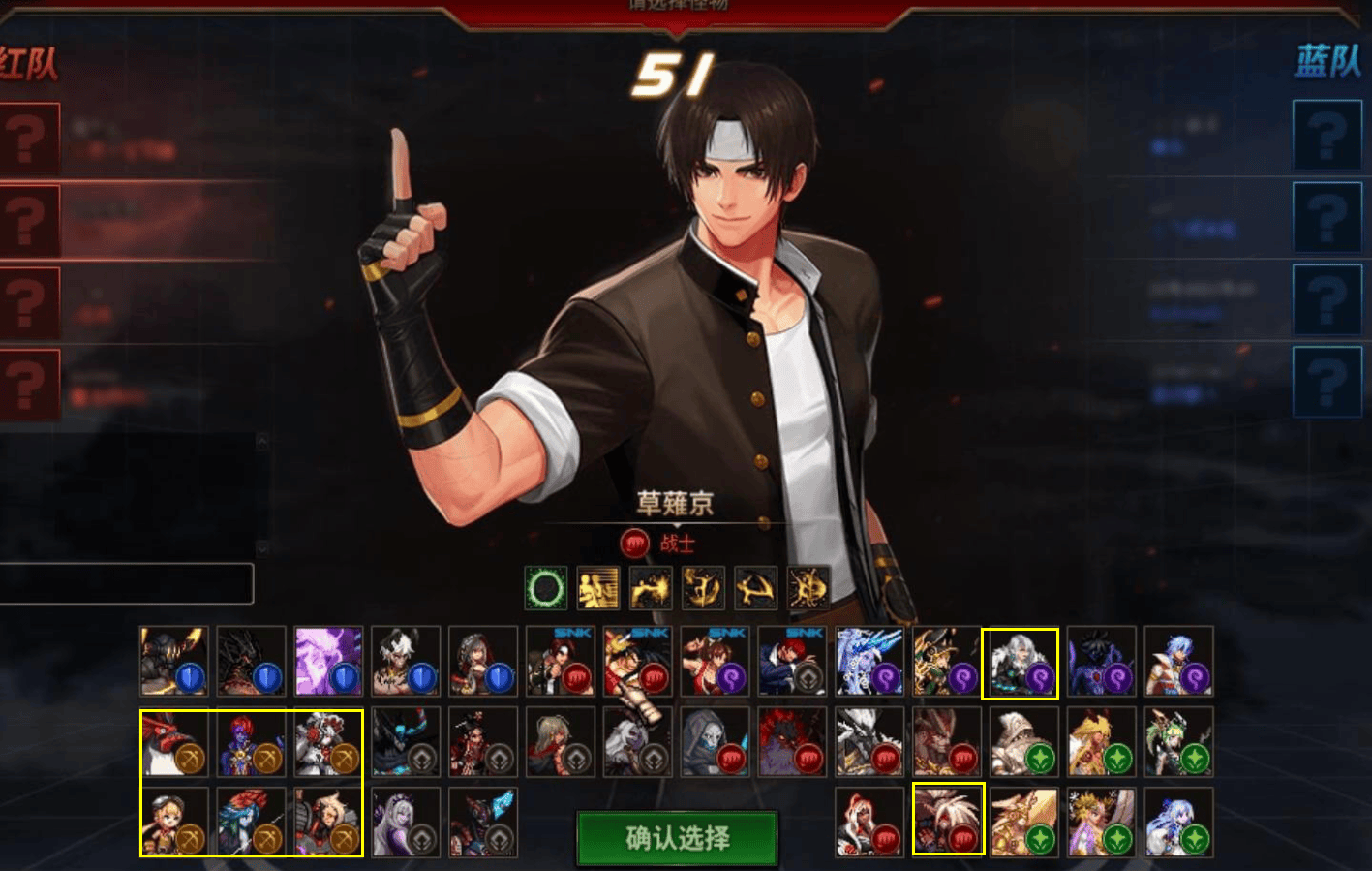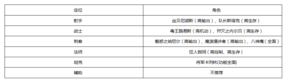 如果不清楚角色如何操控,技能形态等等,除了看技能描述以外,也可以去娱乐赛或者自带的修炼场里尝试。截图所示的黄框内角色是个人相对前期比较推荐的角色,除了辅助以外,其他的角色都可以考虑使用,因人而异。