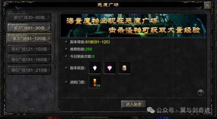 不同等级可进入不同层恶魔广场,每次进入恶魔广场需消耗1个恶魔广场通行证。恶魔广场内会不停刷新怪物,击杀完当前波数所有怪物可刷新下波怪物,击杀怪物越多获得经验越多。