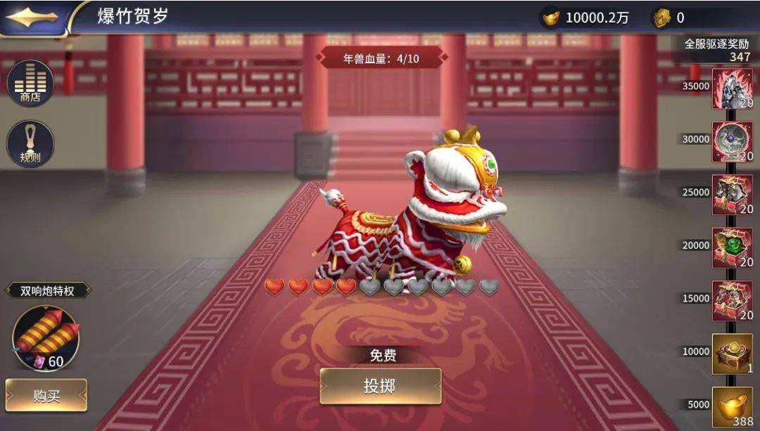 4月24日0点起,游戏内将会开启【爆竹贺岁】活动,投掷爆竹驱赶年兽,获取年兽货币~参与活动即可获取锋矢阵碎片、骕骦神息、乾坤镜神息、130武将/宝物/坐骑自选箱等海量道具奖励~