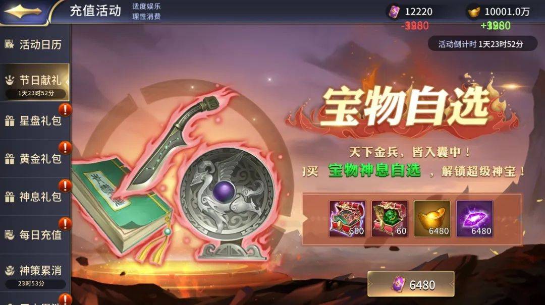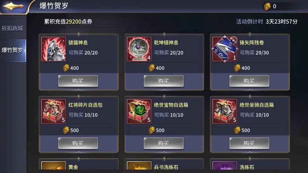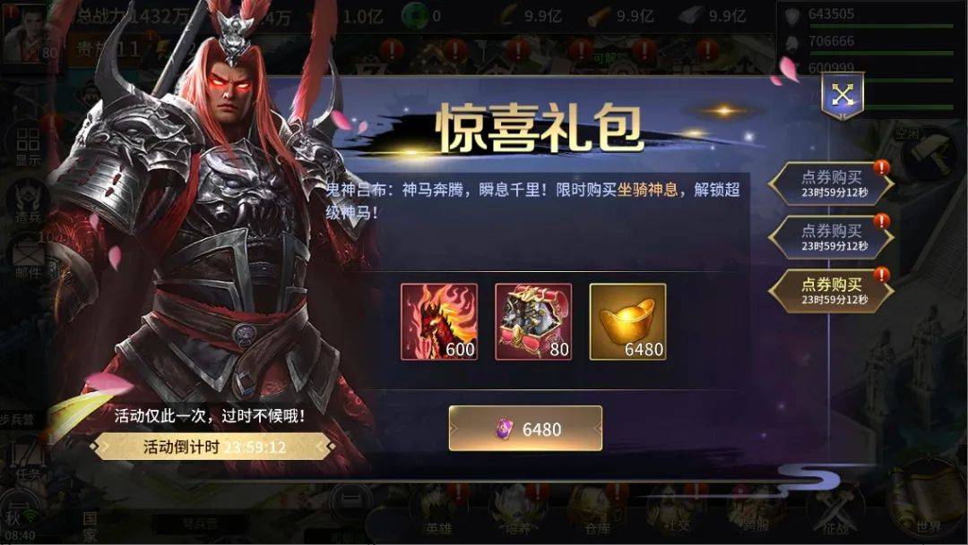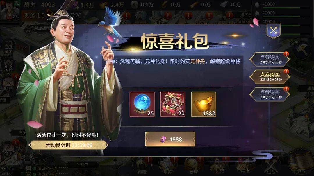 4月26日起至4月29日期间登录游戏的主公,每天都可以购买超高返利的全新惊喜礼包,涵盖计策神息自选箱、宝物神息自选箱、离霄鹿/炼狱赤兔兽神息、元神丹等丰厚道具奖励。