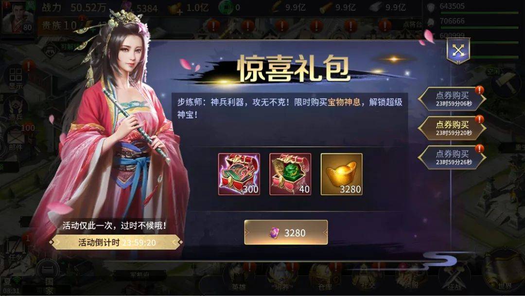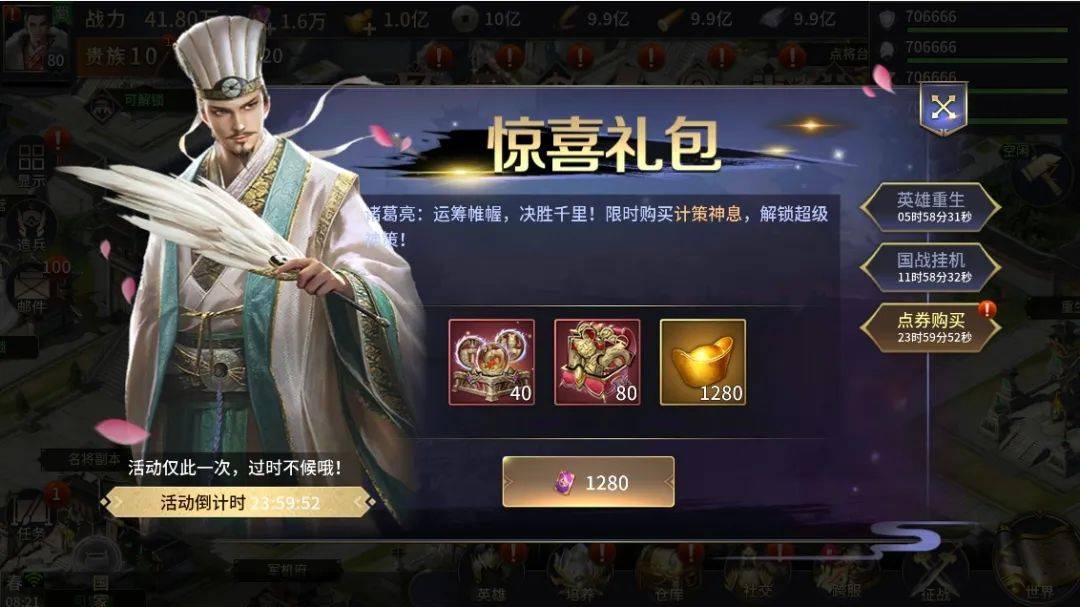 (惊喜礼包的开启受主公等级影响,本次需到71级才会开放对应礼包)