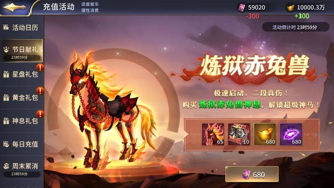 庆祝2024春季到来,春日献礼活动限时开启,本次节日献礼活动将会投放 宝物神息自选箱 ,炼狱赤兔兽神息~请大家根据自身阵容进行养成~