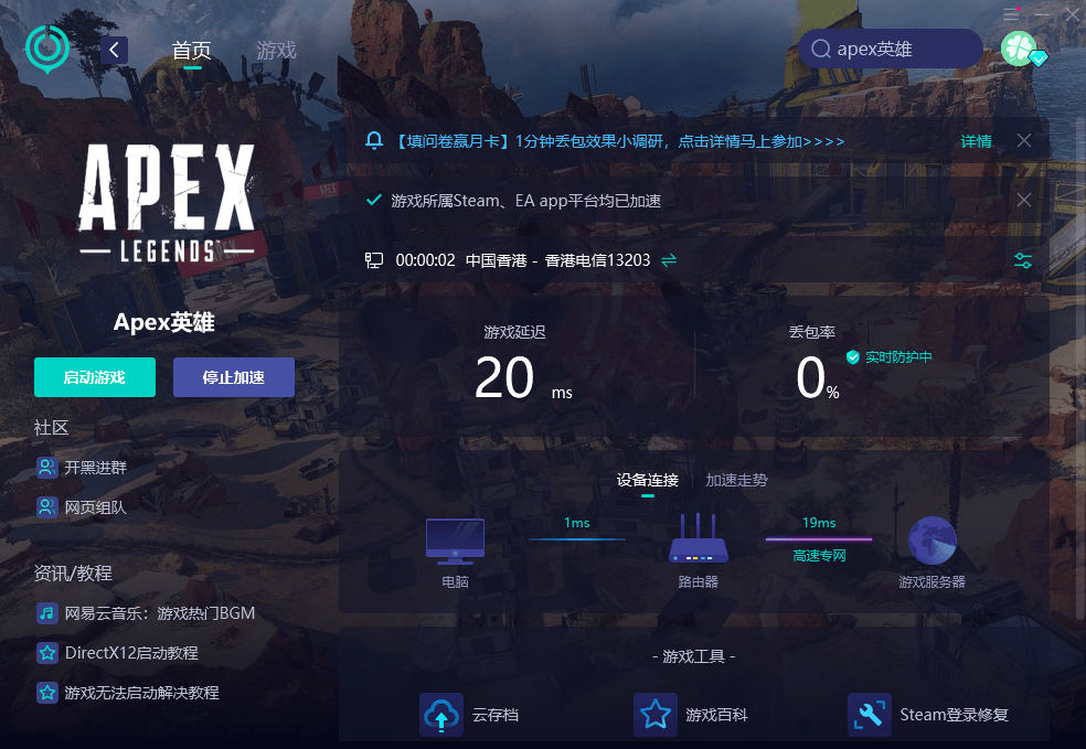 二:点击优化即可获得稳定网络连接,流畅游玩apex英雄