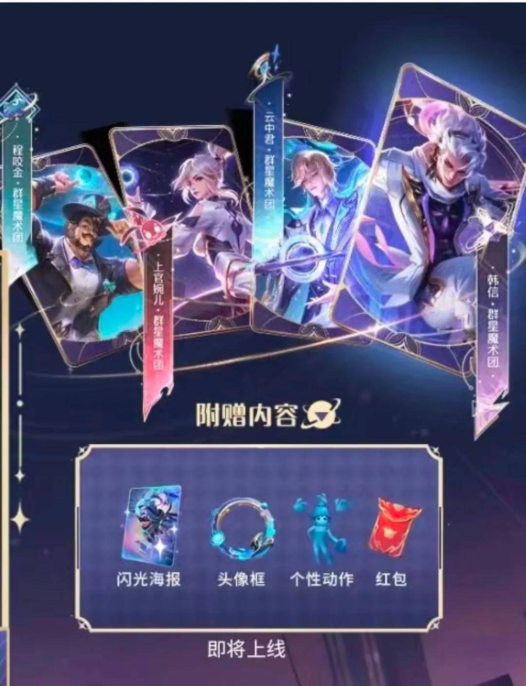 因为在其他的活动已经有所爆料,看到下面的附赠内容中,出现了“闪光海报”。目前这是无双皮肤的标配。当然,也有可能是系列皮肤的海报。但是看具体画面,应该是独属于韩信的,所以韩信的群星魔术团皮肤应该就是无双品质。