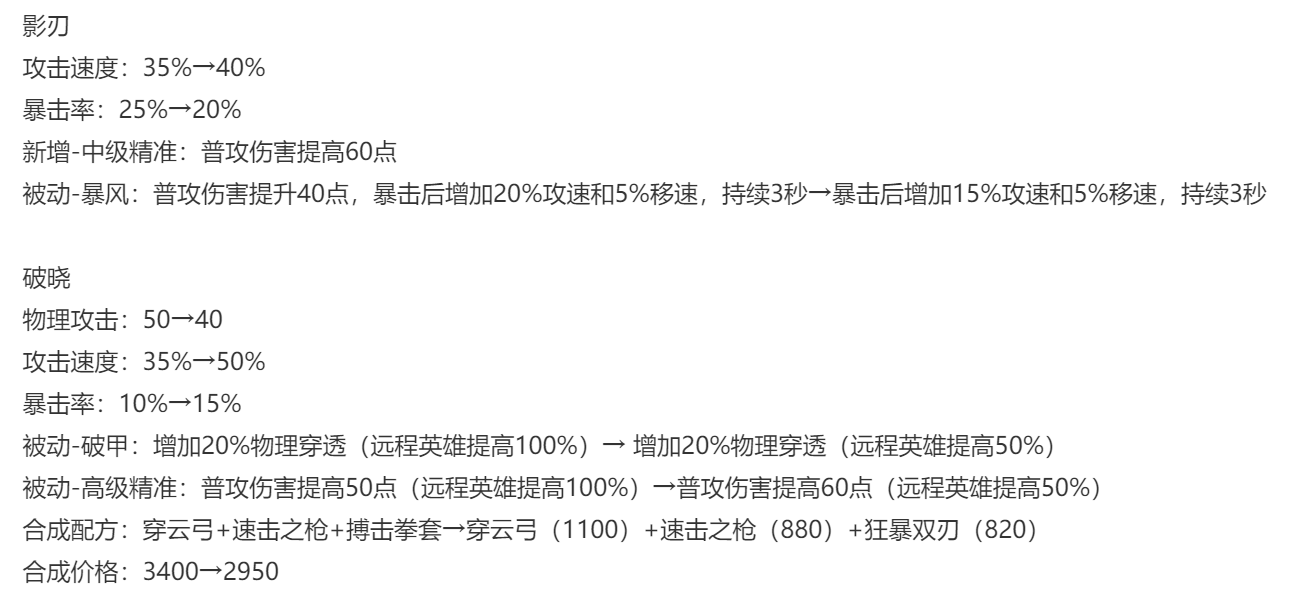 破晓削弱:物攻降低,攻速大幅增加,暴击率增加,远程英雄的破甲比例降低,远程英雄的高级精准普攻伤害降低,价格降低。