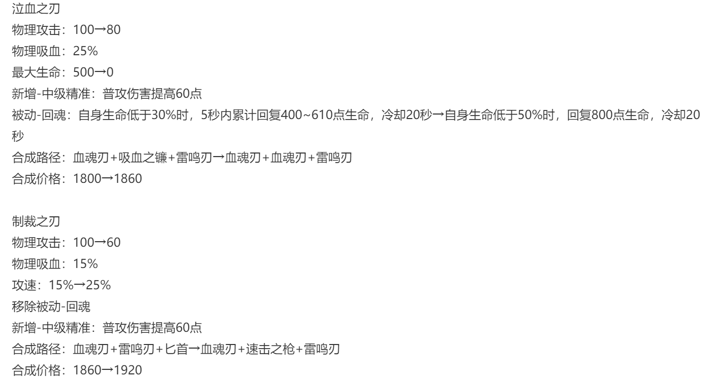 泣血之刃加强:物攻降低,移除生命值属性,新增60点中级精准普攻伤害,被动回血增加,且低于半血就触发,价格增加。