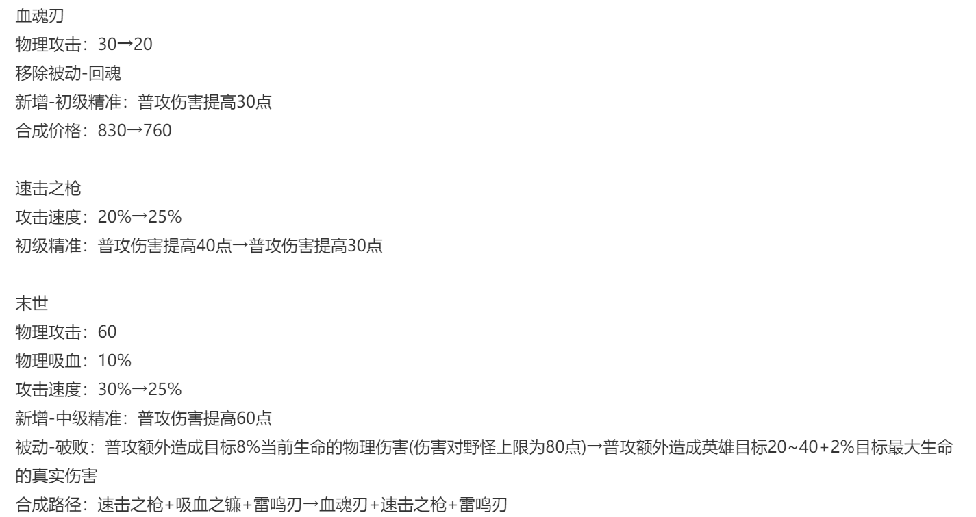 血魂刃加强:移除回血被动,物攻降低,新增30点初级精准普攻伤害,价格降低。